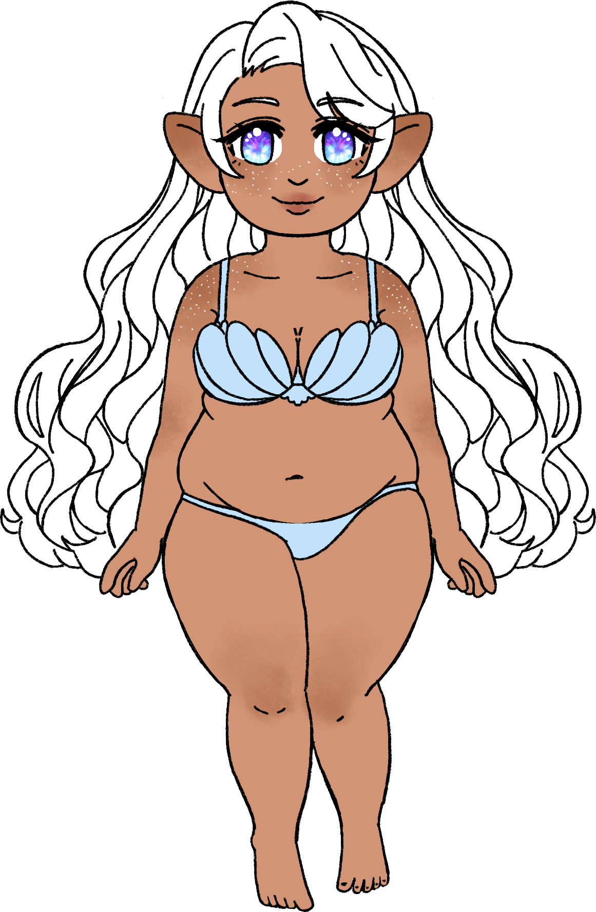 Lunya is considered exceptionally pretty, perhaps even dangerously so, among Lalafellin women. Her looks align with her race's traditional beauty standards with bright, luminous eyes like jewels cherished by the Dunesfolk and the soft fat that indicated a well-fed and healthy young woman to the Plainsfolk. She's pear-shaped with body fat focused in her stomach, upper arms, and thighs.