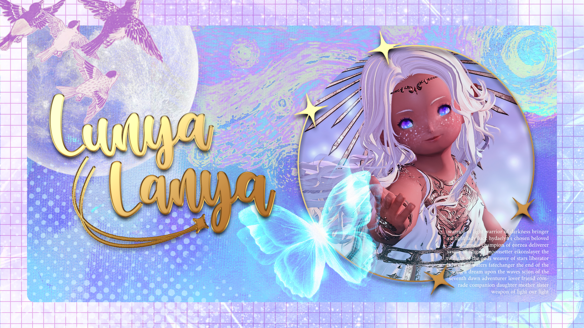 Lunya's primary school of magic is Sharlayan astromancy. While she hasn't spent her whole life studying it like proper astrologians tend to, Lunya had adapted and grown quickly within the field, much to the pride of her mentor, Leveva. Her magic is bright and blinding, but despite its overwhelming potency it tastes nostalgic, like a homecoming long overdue and a wish upon falling stars coming true. You'll be hard-pressed to find any other astrologian on Hydaelyn at Lunya's level these days.