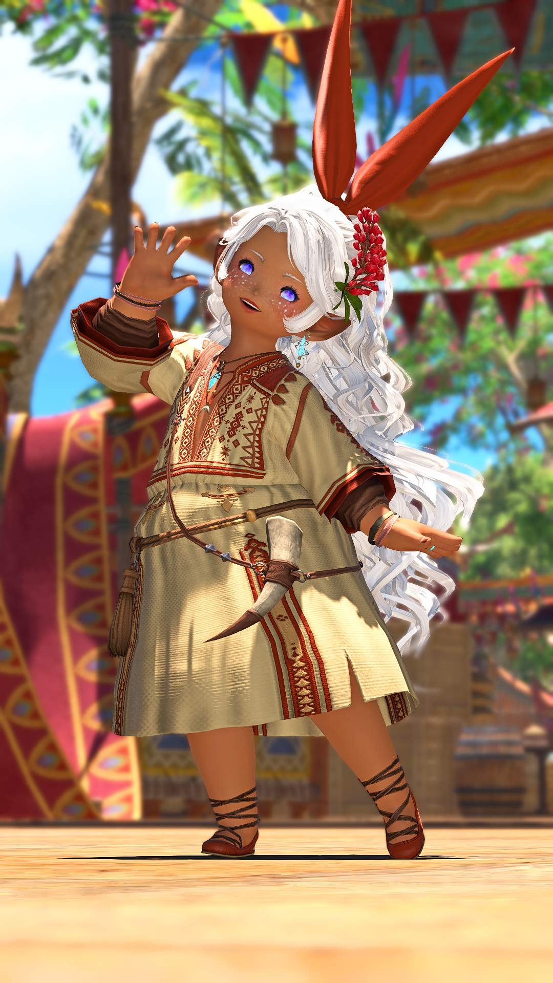 Einar left a chunk of his earnings with Kichirou whenever he returned to Ul'dah and Kichirou used that coin to feed and clothe Yeyema and Sirius. Sirius didn't particularly what he wore but Yeyema had always been enraptured by the displays of Sunsilk Tapestries and he urged Kichirou to use more of his share of the clothing budget to get Yeyema dresses and ribbons. While many of these were ready-to-wear Ul'dahn tunics, Kichirou splurged more than a few times to rent a table in the Weavers' Guild to make her some bespoke pieces in different styles from his travels.